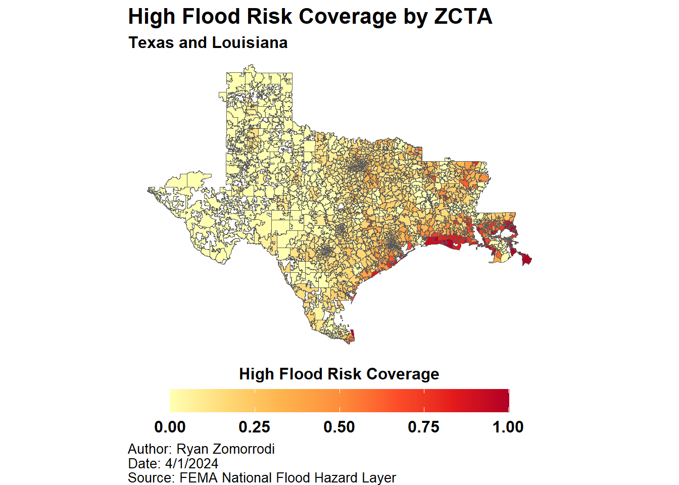 caption = "Author: Ryan Zomorrodi\nDate: 4/1/2024\nSource: FEMA National Flood Hazard Layer")Reading layer `ZCTAs' from data source