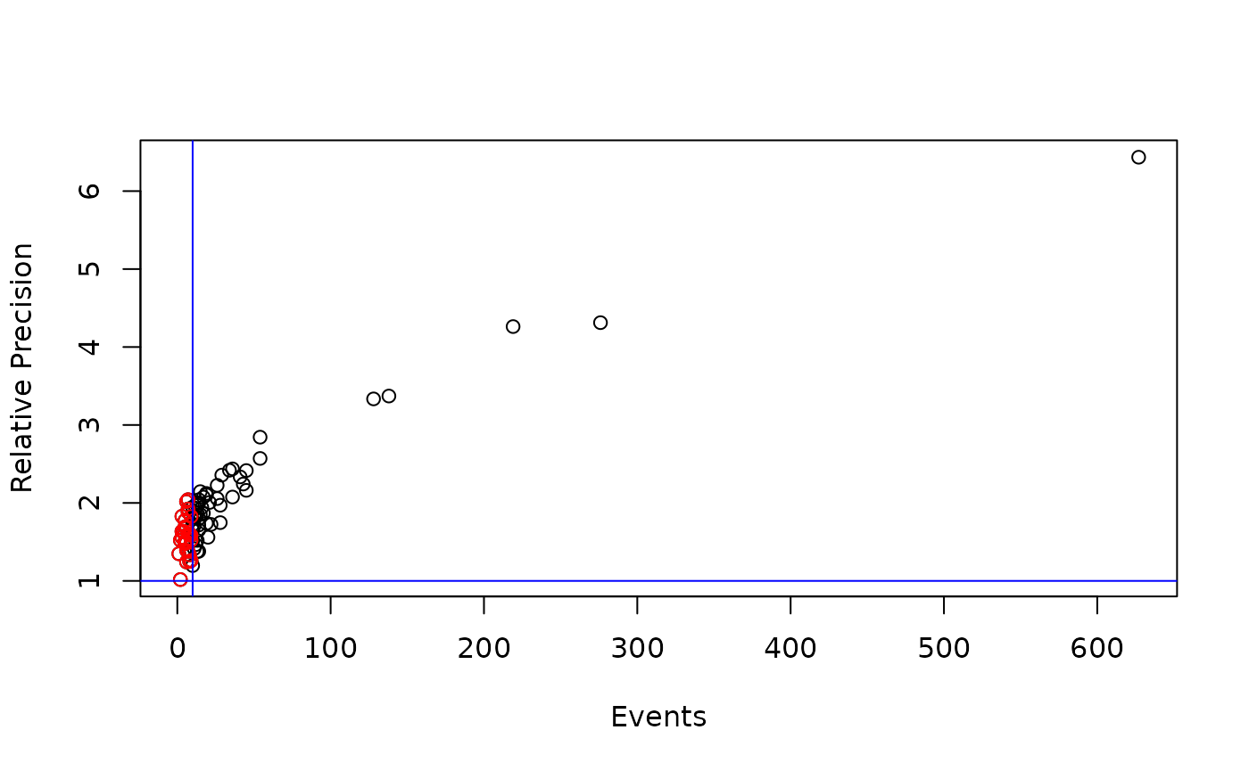 points(estimates_supp$events, estimates_supp$rel_prec, col = "red")