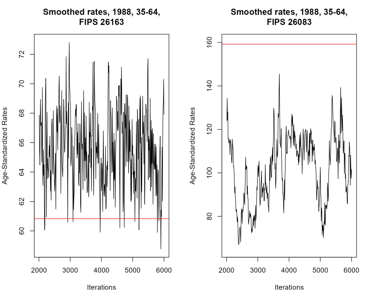 Here, we have two traceplots representing our sample values over time for a given county-group-year. On the left, we can see a traceplot for the highest-population county, and on the right is a traceplot for the lowest-population county. Each traceplot also includes a red line representing the mean event rate for that county-group-year. Note that in both traceplots, the mean line is nearby the plots, but either higher or lower than their general trend, indicating that the rates in both of these counties were attenuated thanks to spatial smoothing.
